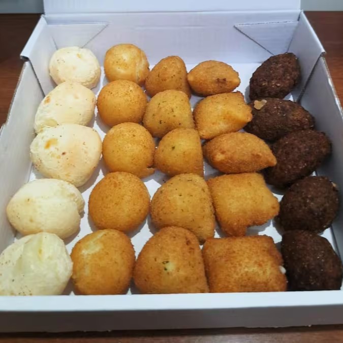 Monte e confira nossa irresistível Caixa de 25 Minis (625g), perfeita para atender de 2 a 3 pessoas! Cada mini salgadinho pesa 25g e você pode escolher entre Pão de Queijo, Churros, Coxinha de Frango, Bolinha de Queijo, Travesseirinho de Carne, Croquetinho de Pizza, Enroladinho de Vina/Salsicha, Kibe, Kibe com Requeijão e Dadinho de Tapioca.