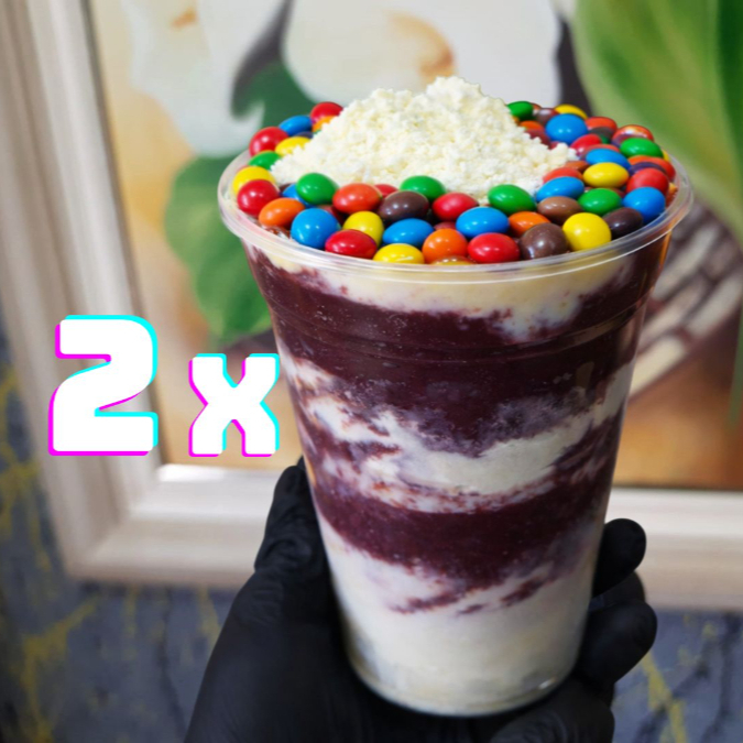 Experimente o combo perfeito: Açaí cremoso + Cupuaçu com sabor único da Amazônia, juntos em dobro para você aproveitar! Disponível nos tamanhos 330ml, 440ml, 550ml, 770ml ou 1000ml! Cada copo vem com 2 adicionais gratuitos, e você pode deixar ainda mais gostoso adicionando extras como Leite em Pó Ninho, Leite Condensado Moça, Paçoquita, Ovomaltine, Granola, Amendoim Granulado e mais! (Não entregamos complementos/adicionais separados.)