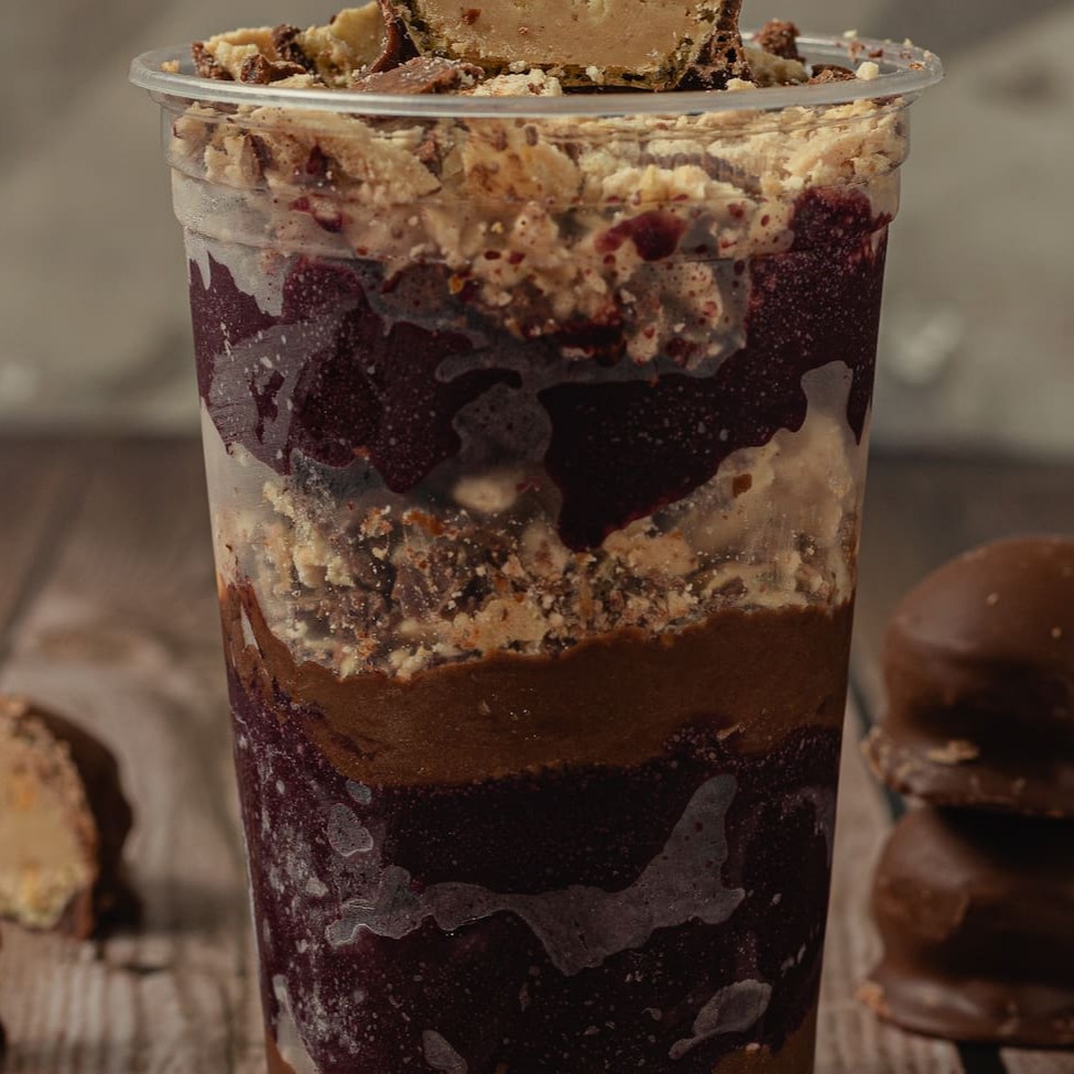 Nosso delicioso creme de açaí recheado com uma perfeita combinação de leite condensado com amendoim.