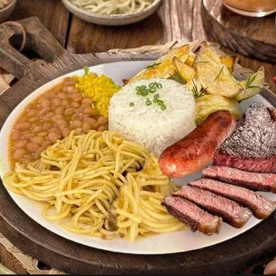 Arroz, feijão, macarrão e batata rústica, acompanhados de 3 cortes bovinos e 1 linguiça toscana, todos assados na brasa.