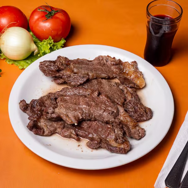 Comida caseira de qualidade: arroz, feijão, macarrão, batata tipo rústica ou polenta frita e 01 unidade de filé argentino grelhado na brasa.