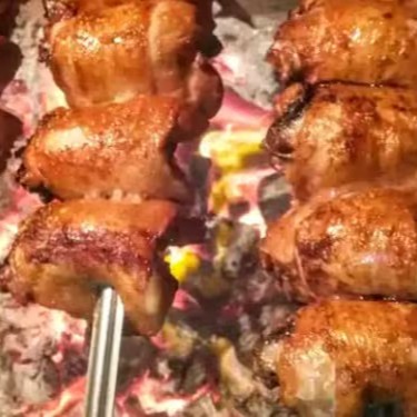 Cubos de peito de frango com bacon intercalados, grelhados no fogo.
