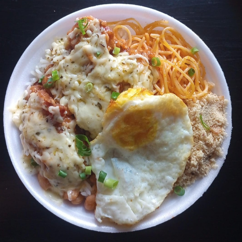 2 MAMITEX MÉDIA COM ARROZ, FEIJÃO, FAROFA E ESPAGUETE A MODA DA CASA + SALADA DO DIA