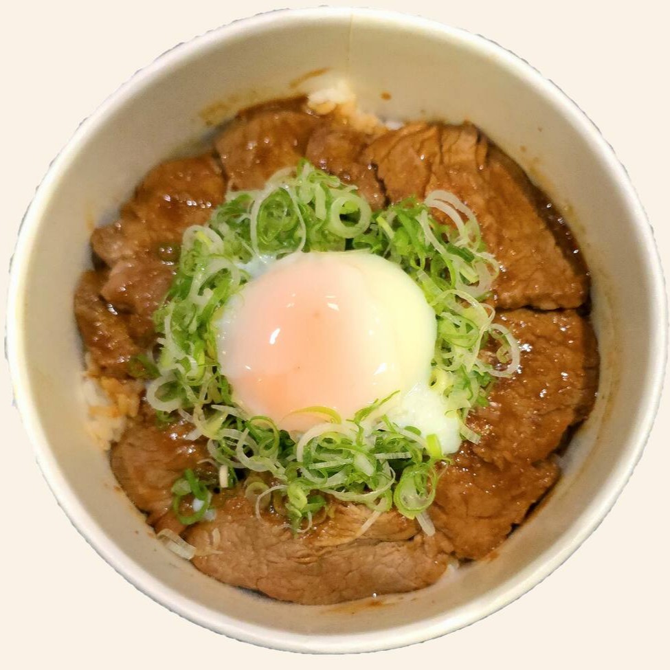 Arroz, tiras de entrecôte, cebola caramelizada, cebolinha, fatias finas de gengibre e ovo cozido de baixa temperatura com gema mole. Pronto para consumo.