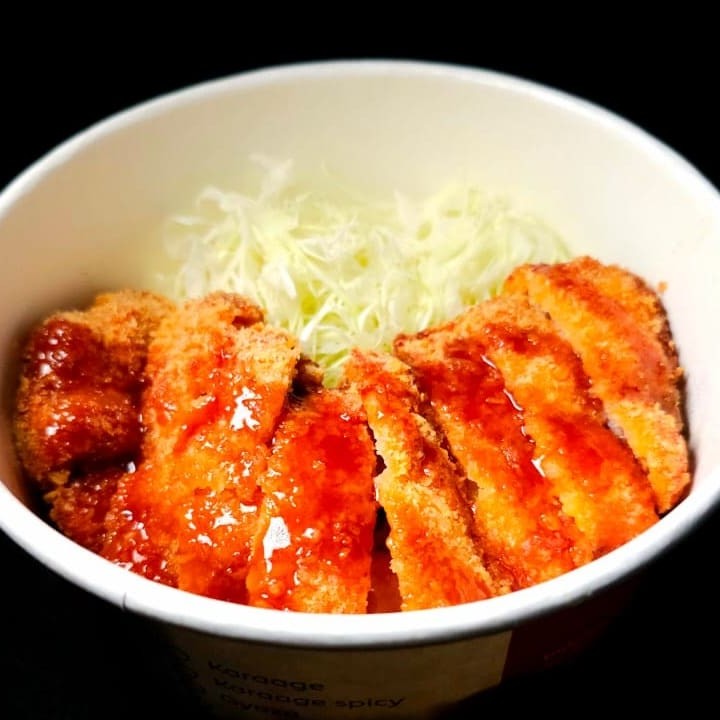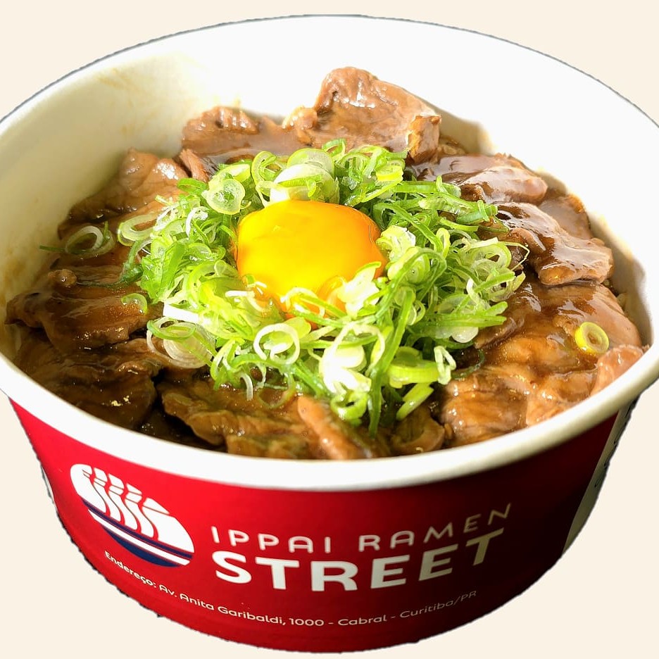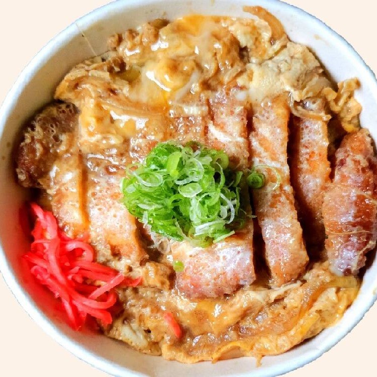Arroz (300g), tonkatsu (copa lombo empanado no estilo japonês com farinha panko), cebola caramelizada, cebolinha e ovo cozido de baixa temperatura com gema mole. Pronto para consumo.