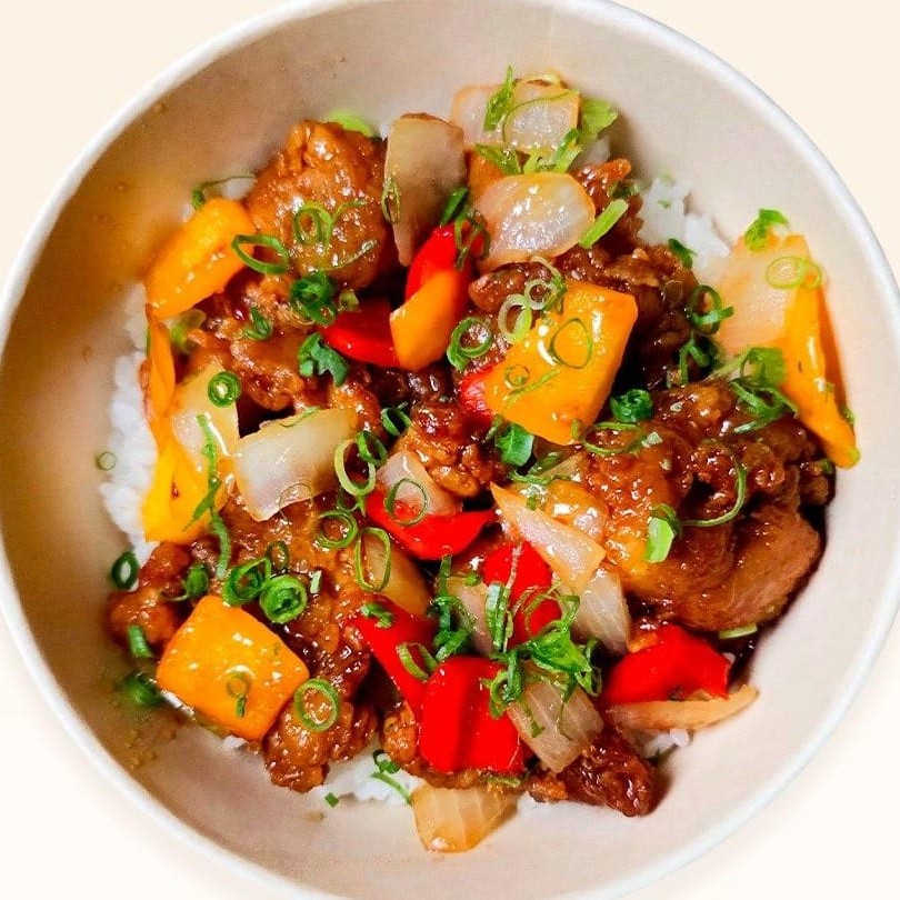Arroz(300g), frango frito no estilo japonês (300g), molho de laranja agridoce com toque de pimenta, pimentão vermelho e amarelo, e cebola. Pronto para consumo.