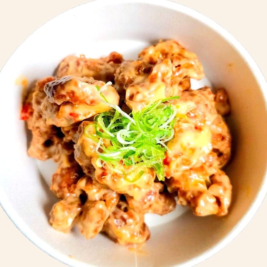 Frango frito no estilo japonês, envolto com molho a base de maionese e pimenta chili.