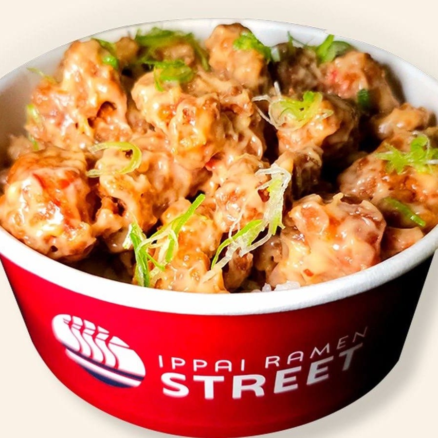 Arroz (150g), frango frito no estilo japonês (150g), molho a base de maionese e pimenta chilli, e cebolinha. Pronto para consumo. Não é possível tirar a pimenta deste prato.