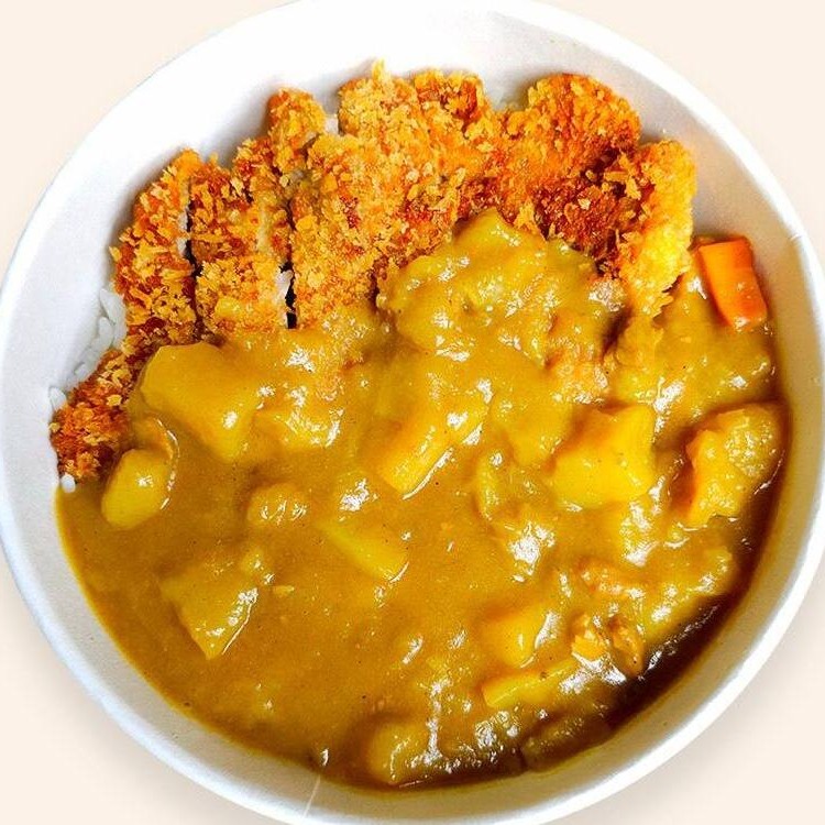 Arroz (300g), tonkatsu (copa lombo empanado no estilo japonês com farinha panko), molho kare e legumes.
