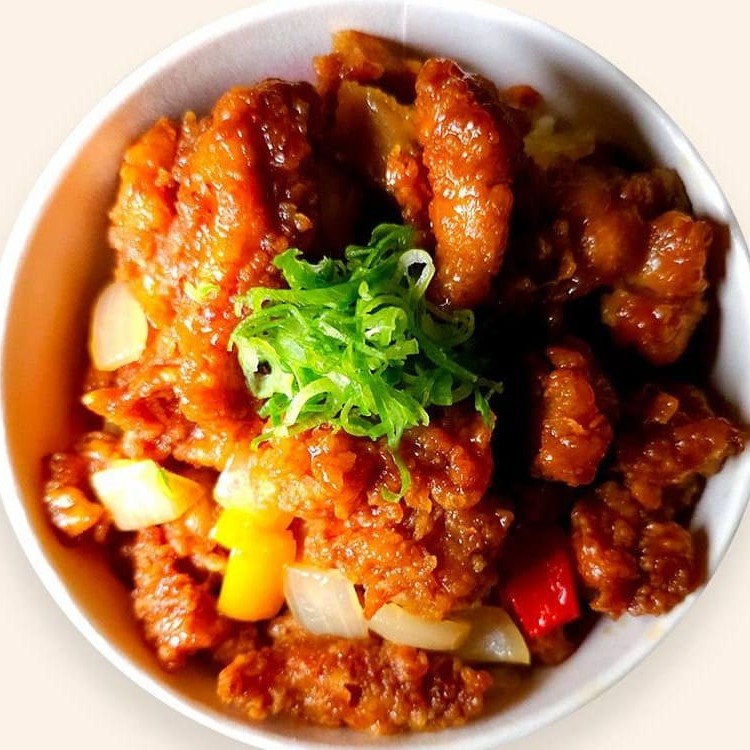 Arroz, frango frito no estilo japonês, molho especial a base de maionese e pimenta chilli, e cebolinha. Não é possível tirar a pimenta deste prato. Pronto para consumo.