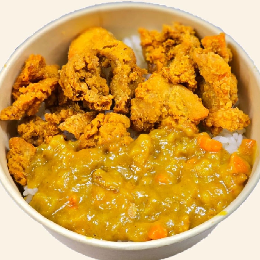 Arroz, frango frito no estilo japonês (temperado com shoyu e sake), molho kare e legumes. Pronto para consumo.