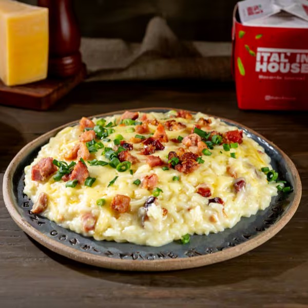 Cozido com caldo de legumes e costela desfiada. Esse molho é combinado ao risoto, criando uma textura cremosa e cheia de sabor. Finalizado com queijo parmesão e manteiga. Finalizado com queijo e cebolinha. (aprox. 650g)