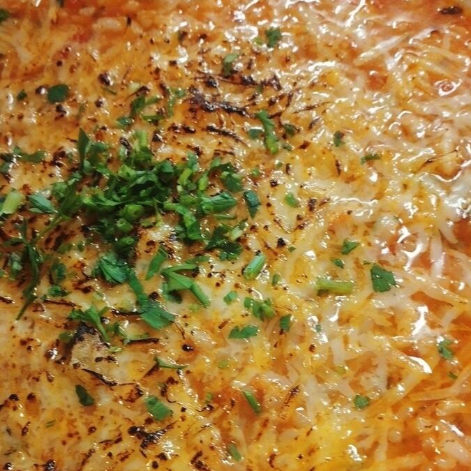Risotto rústico de frango caipira, úmido, com tomate fresco, salsinha, brodo e queijo derretido.