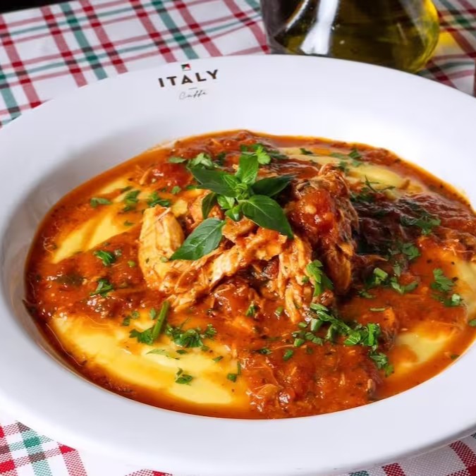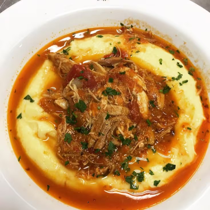 Galinha caipira da Nonna desossada, feita na panela com molho de tomate e ervas frescas e polenta caseira cremosa.