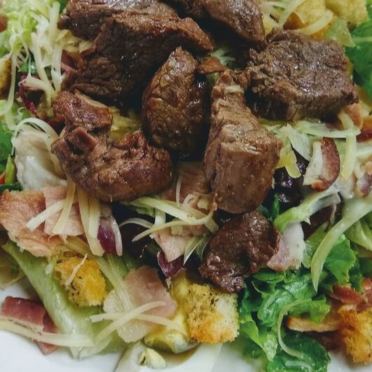 Tiras de mignon grelhadas, mix de folhas verdes, croutons, ovo, parmesão e molho especial da casa.