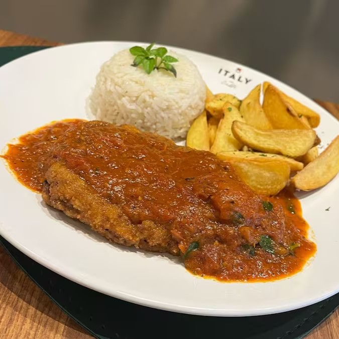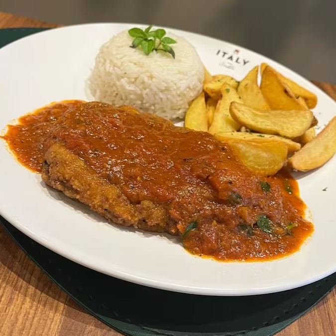 Mignon à parmeggiana, gratinado com mozarela e molho sugo. Acompanha: arroz branco e batatas rústica ou Fettuccine 3 queijos. 500g