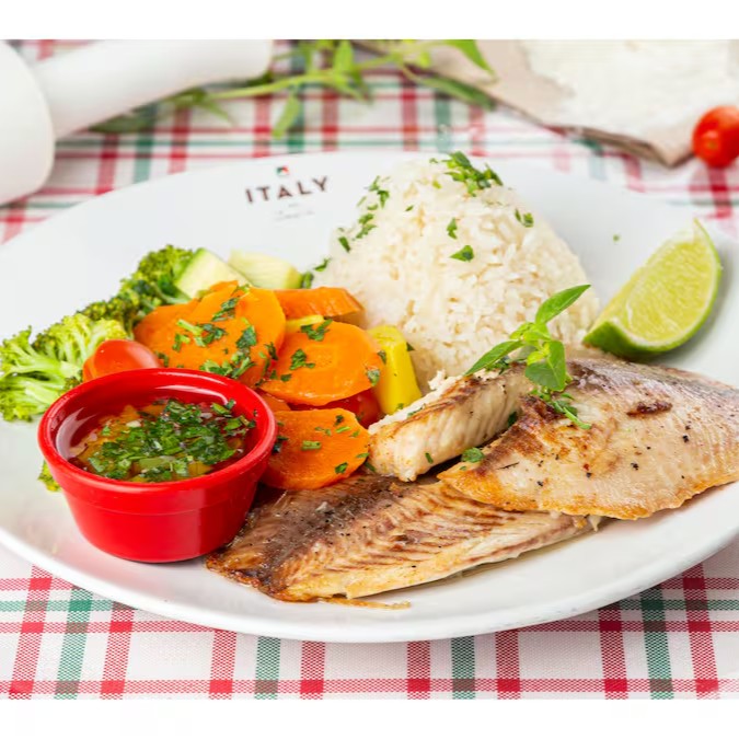 Filé de tilápia grelhado com vinagrete de manjericão, arroz branco e legumes.