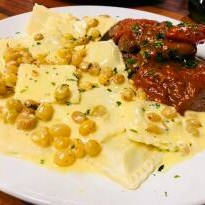 Mignon ao molho de tomate italiano com manjericão e ravióli de queijo com molho cremoso de parmesão e uvas secas.