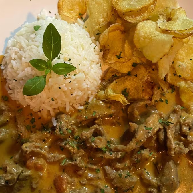 Strogonoff de mignon, com arroz branco e batata chips artesanal.