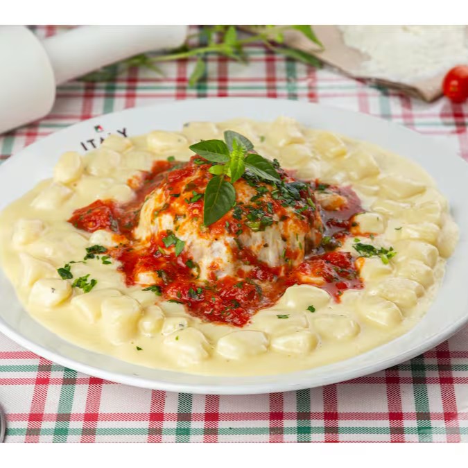 Polpettone recheado com queijo mozarela ao molho sugo. Acompanha: gnocchi de batata ao molho cremoso de queijos.