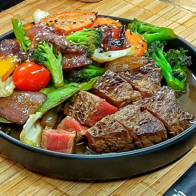 Desfrute do nosso Teppanyaki - um espetáculo da culinária oriental! Este prato quente é composto por uma seleção de vegetais frescos e especiais, como ervilha torta, suculento tomate cereja, cebola roxa adocicada, cenoura crocante, brócolis nutritivo e pimentão colorido, todos habilmente salteados e grelhados em nosso molho especial. Acompanhando esses vegetais vibrantes, temos cubos tenros de alcatra, grelhados na chapa até atingir a perfeição. Cada porção desse prato traz uma explosão de sabores e texturas, que prometem encantar o seu paladar. (Observação: a proteína é pesada in natura).