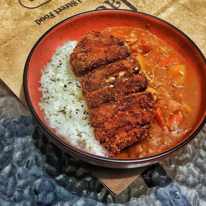 Ensopado japonês ao molho karê (curry). Acompanha empanado suíno e gohan (arroz japonês).