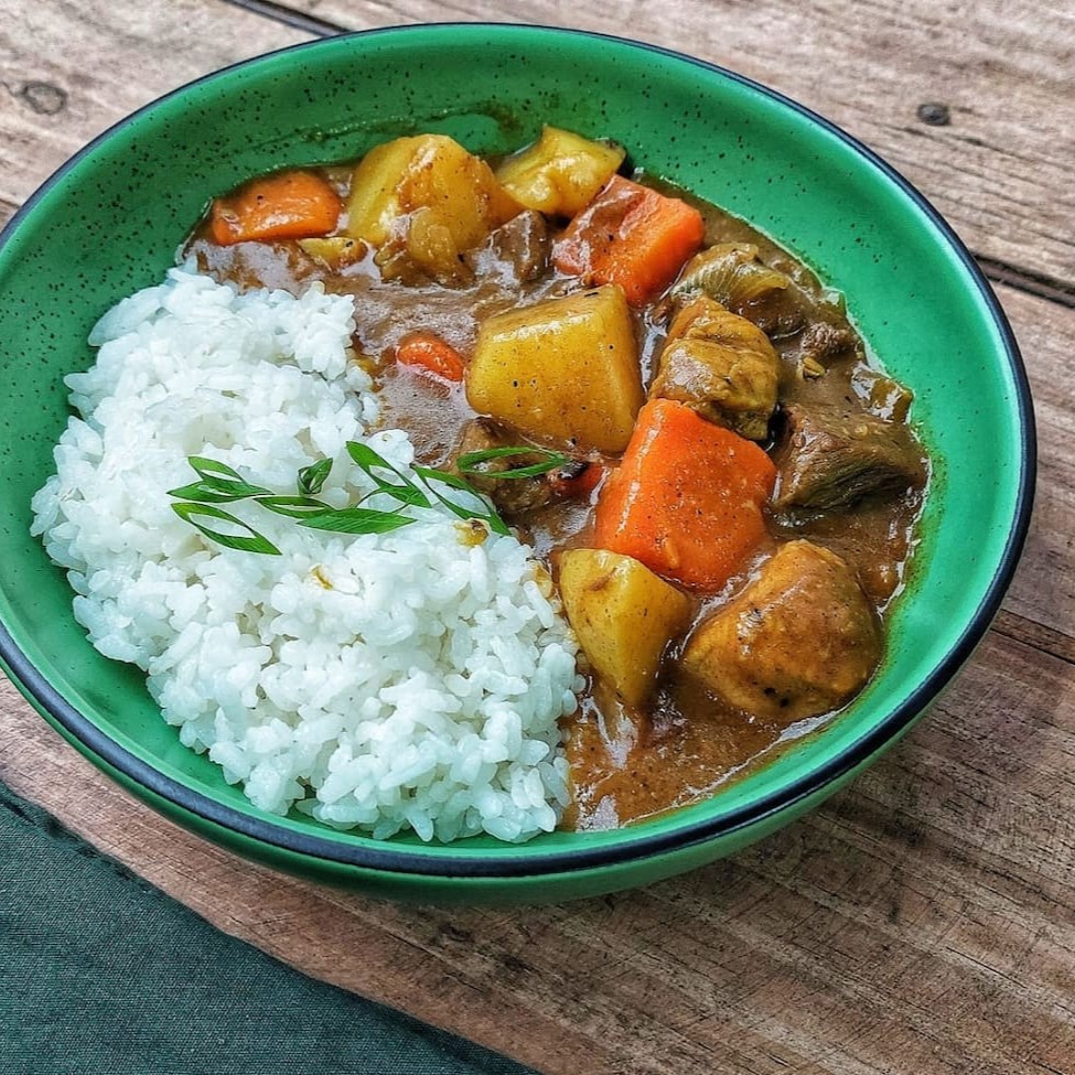 Ensopado Japonês de vegetais ao molho Karê (curry) e shitake. Acompanha Gohan (arroz japonês)