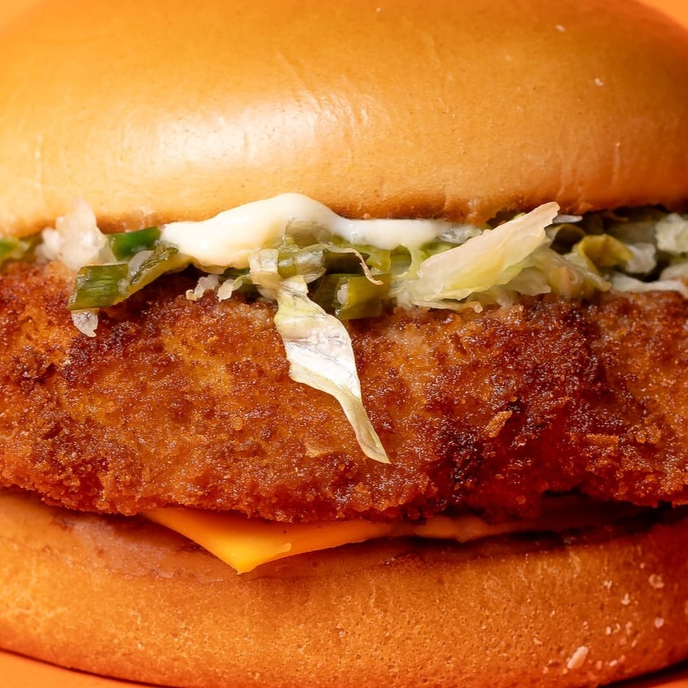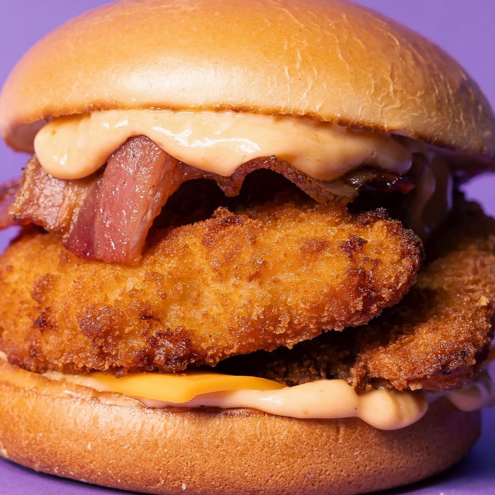 Pão brioche, queijo cheddar, molho picante, frango frito e bacon.