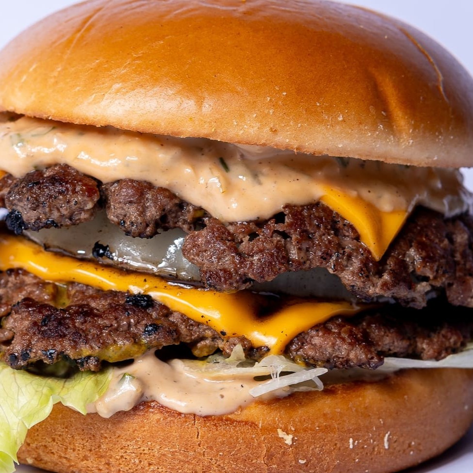 Pão brioche, dois smash burgers feitos na mostarda, uma fatia de cebola grelhada, queijo cheddar, alface, tomate e molho especial. Inspirado na rede americana In n Out.