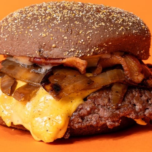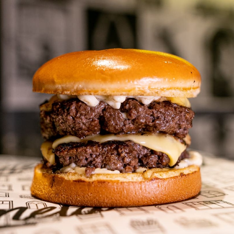 Pão Australiano, dois smash burgers 60g, muuuito cheddar melt, cebola caramelizada, bacon e maionese da casa.
