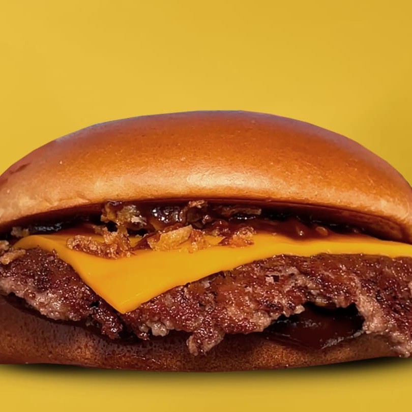 Pão brioche, 1 smash burger de 60g, queijo cheddar, molho barbecue e cebola crispy.