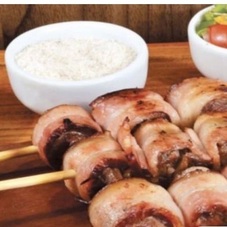 Delicioso espetinho de medalhão de carne com bacon cuidadosamente preparado e assado a perfeição, cada espetinho contém aproximadamente 100 gramas