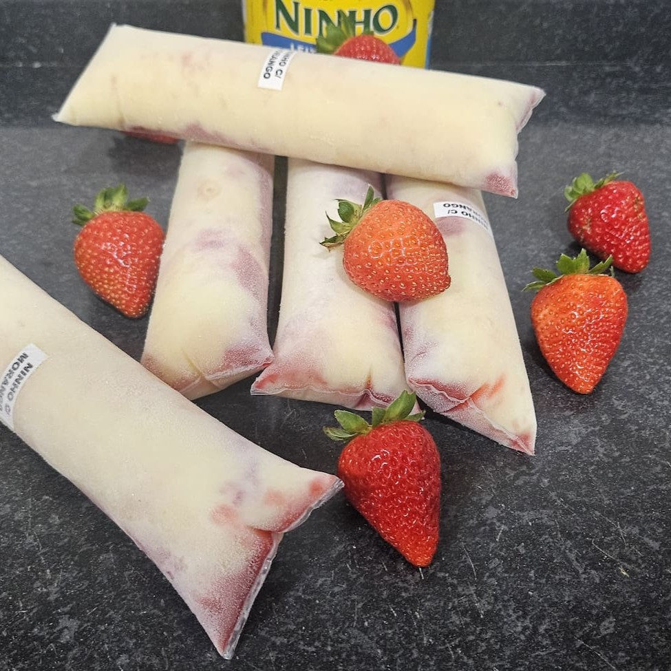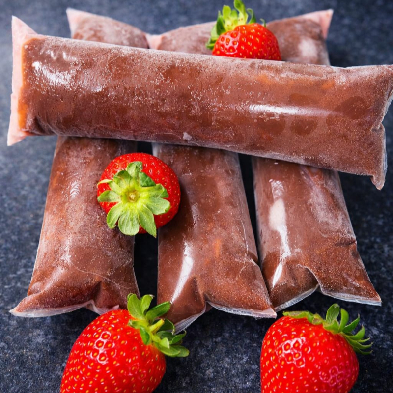 Geladinhos gourmet 200ml de morango natural com chocolate.