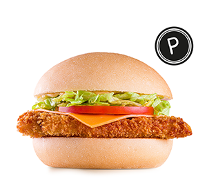 Pão, 2 peitos de frango empanados crocantes (60 g*), bacon, maionese, queijo tipo cheddar, alface e tomate orgânicos. *Peso in natura antes da cocção.