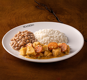 Moqueca vegana de palmito, arroz branco e feijão - Aprox. 400 g (quando quente para consumo). Escolha receber seu prato quente ou congelado, produto enviado em embalagem plástica.