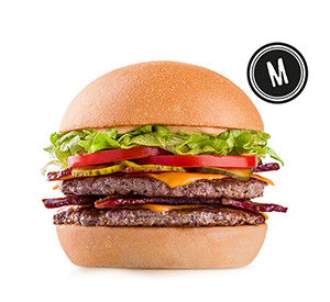 Pão, 2 hamburguers (70 g* cada), bacon, maionese, queijo tipo cheddar, relish de pepino, alface e tomate orgânicos. *Peso in natura antes da cocção.