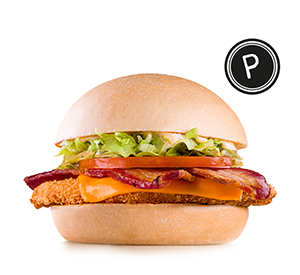 Pão, 2 peitos de frango empanados crocantes (60 g*), bacon, maionese, queijo tipo cheddar, alface e tomate orgânicos. *Peso in natura antes da cocção.