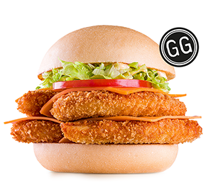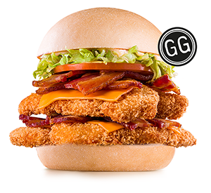 Pão, 2 peitos de frango empanados crocantes (60 g*), bacon, maionese, queijo tipo cheddar, alface e tomate orgânicos. *Peso in natura antes da cocção.