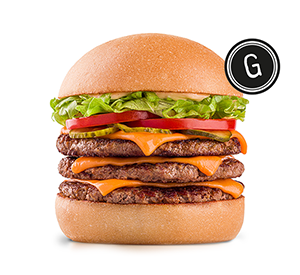 Pão, 3 hamburguers (70 g* cada), maionese, queijo tipo cheddar, relish de pepino, alface e tomate orgânicos. *Peso in natura antes da cocção.