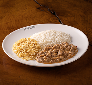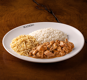 Estrogonofe de filé argentino , arroz e batata palha. - aprox. 300 g (quando quente para consumo). Escolha receber seu prato quente ou congelado, produto enviado em embalagem plástica.