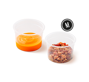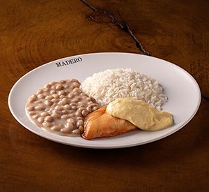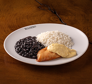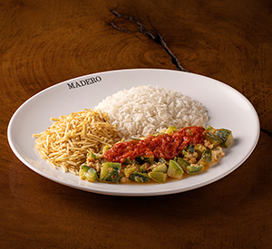 Carne moída bovina temperada, arroz branco e feijão preto. - Aprox. 350 g (quando quente para consumo). Escolha receber seu prato quente ou congelado, produto enviado em embalagem plástica.