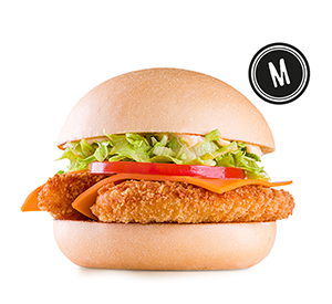 Pão, 2 peitos de frango empanados crocantes (60 g* cada), maionese, queijo tipo cheddar, alface e tomate orgânicos. *Peso in natura antes da cocção.