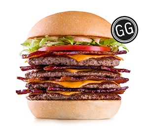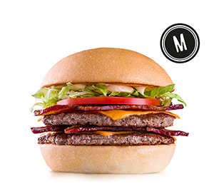 Pão, 2 hamburguers (70 g* cada), bacon, maionese, queijo tipo cheddar, alface e tomate orgânicos. *Peso in natura antes da cocção.