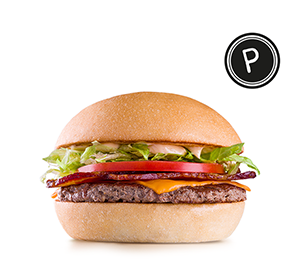 Pão, 1 hamburguer (70 g*), bacon, maionese, queijo tipo cheddar, alface e tomate orgânicos. *Peso in natura antes da cocção.