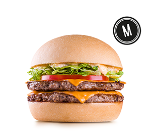 Pão, 2 hamburguers (70 g* cada), maionese, queijo tipo cheddar, alface e tomate orgânicos. *Peso in natura antes da cocção.