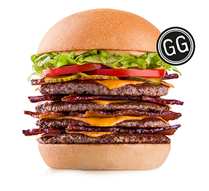 Pão, 4 hamburguers (70 g* cada), bacon, maionese, queijo tipo cheddar, relish de pepino, alface e tomate orgânicos. *Peso in natura antes da cocção.