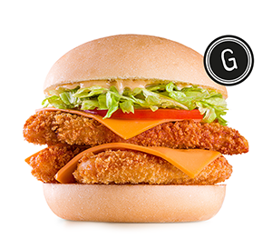 Pão, 2 peitos de frango empanados crocantes (60 g*), bacon, maionese, queijo tipo cheddar, alface e tomate orgânicos. *Peso in natura antes da cocção.