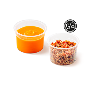 Carne moída bovina temperada, arroz branco e feijão preto. - Aprox. 350 g (quando quente para consumo). Escolha receber seu prato quente ou congelado, produto enviado em embalagem plástica.