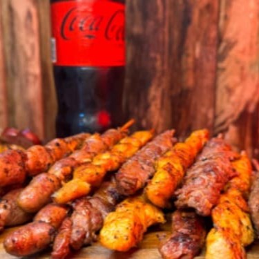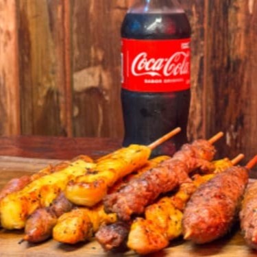 Perfeito para matar sua fome! São 7 Espetinhos + Refri 350ml: 2 de Carne, 2 de Frango, 1 de Queijo coalho, 1 de Pão de alho, 1 Especial (Cafta com queijo, Medalhão de porco ou frango) + 1 Refrigerante lata 350ml