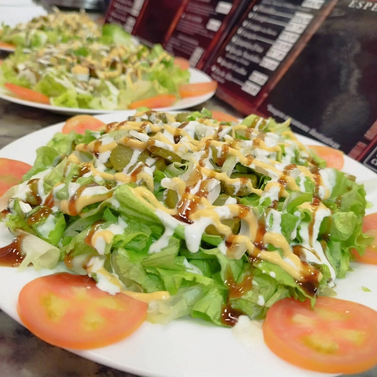 Alface, tomate, cebola, pepino em conserva, molho do joca, barbecue e molho rose.